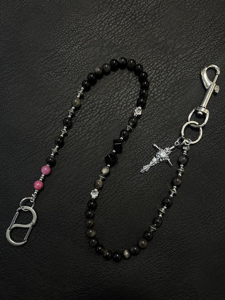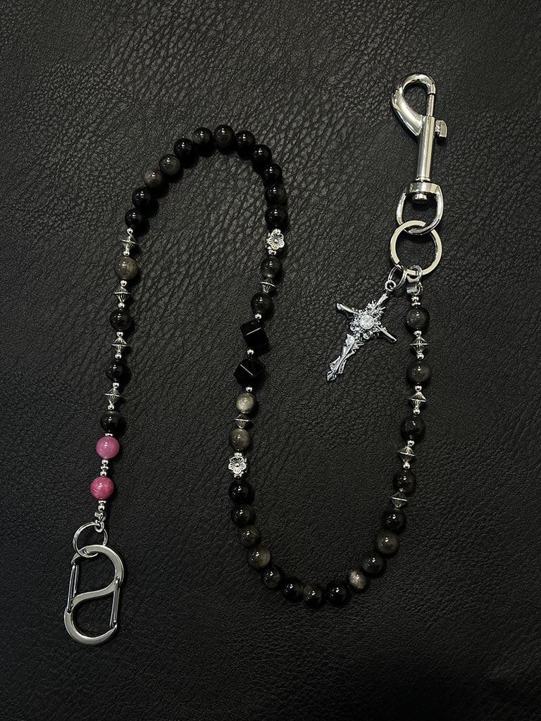 Gothic Elegance Beaded Wallet Chain �Obsidian Stone & Cross Charm