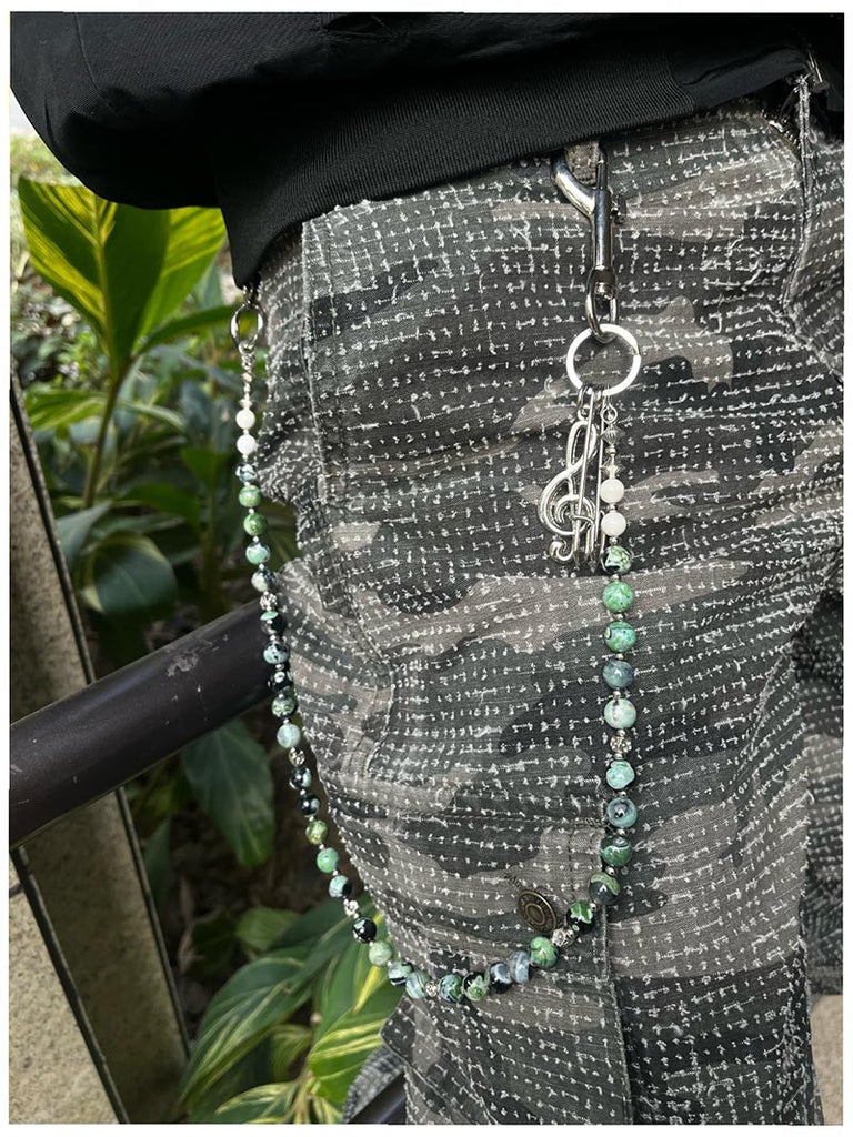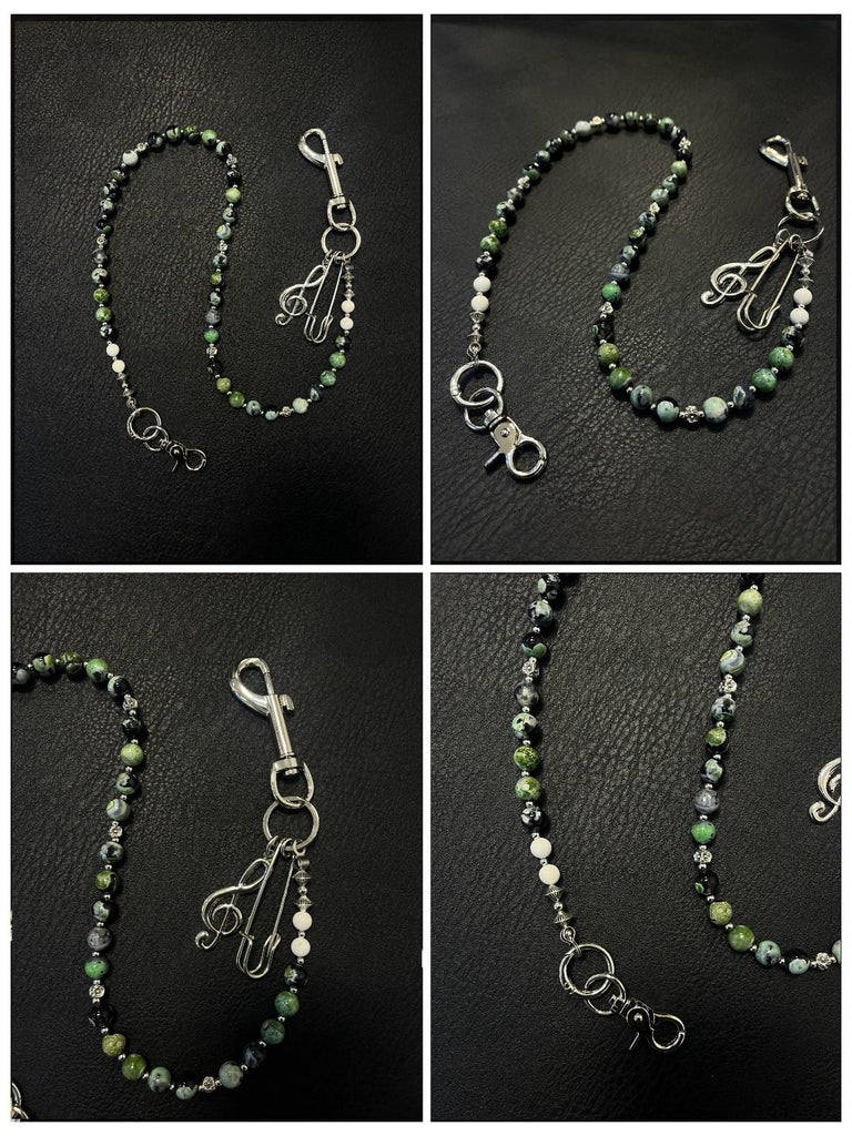 Discover a truly unique accessory with our stunning beaded Wallet Chain, where artistic inspiration meets urban functionality. This 78cm masterpiece features exquisite blue stone beads with natural watercolor-like veining, elegantly paired with delicate plum blossom beads that create a captivating visual rhythm. The chain is finished with a distinctive music note charm and a bold safety pin accessory near the clasp, making this beaded pants chain a perfect blend of artistic expression and alternative edge.