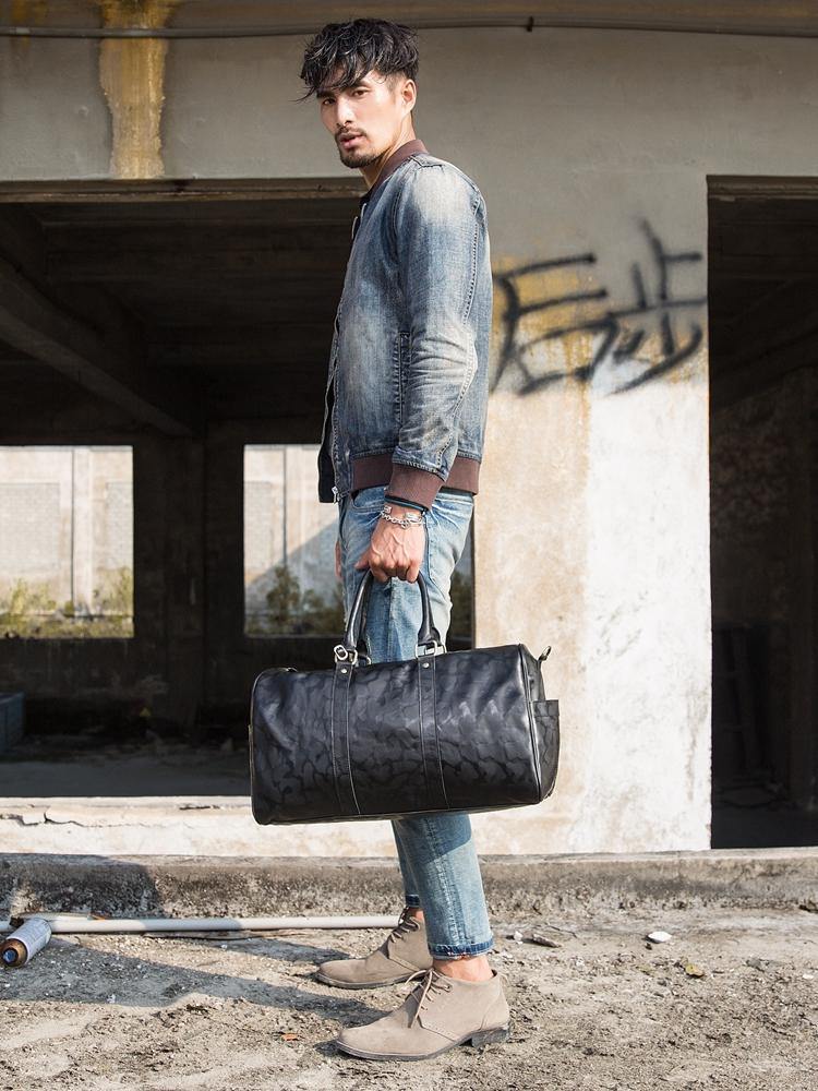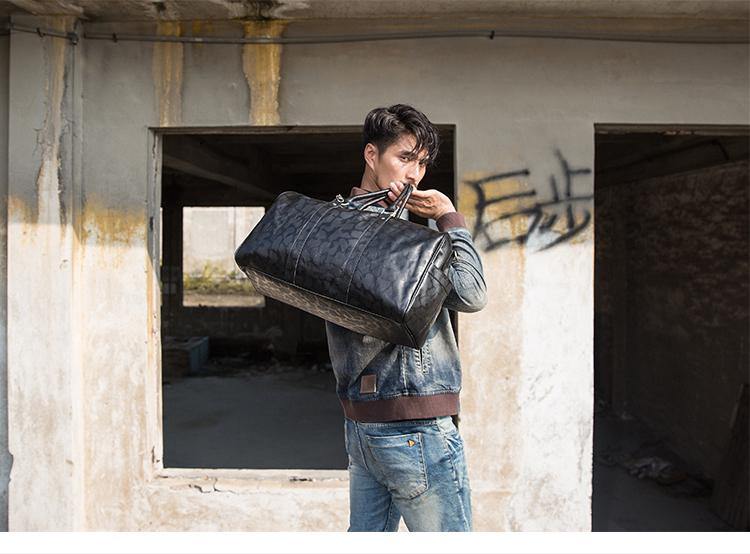 Design: Black Leather Mens 16 inches Weekender Crossbody Bag Travel Bags Shoulder Bags for men
