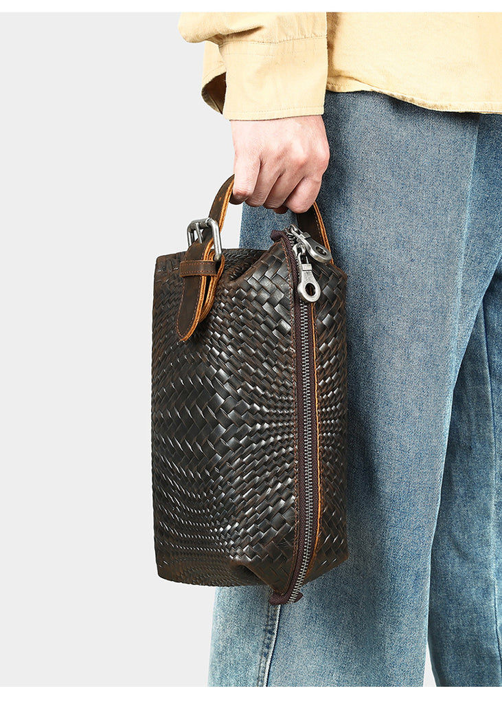 Discover the perfect blend of rugged sophistication and practical organization with our premium Brown Leather Toiletry Bag, expertly crafted for the modern man who values both style and functionality. This versatile Full Grain Leather Toiletry Bag features a distinctive woven-texture finish—meticulously embossed into the supple crazy horse leather for enhanced visual depth and tactile appeal—making it a standout piece for travel, gym, or daily use. Measuring 25.5cm x 14cm x 10cm, this rectangular organizer offers a thoughtfully designed interior with a main compartment, internal zippered pocket, 6 card slots, and a dedicated phone sleeve, all secured with a comfortable top carry handle for easy portability as a hand-carry case or under-arm clutch.
