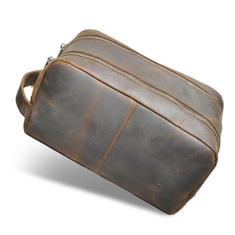 Design: Dark Brown Leather Toiletry Bag Double Zipper Toiletry Bag for Men