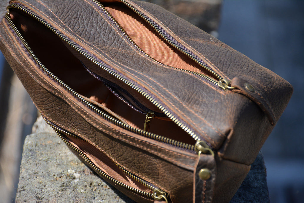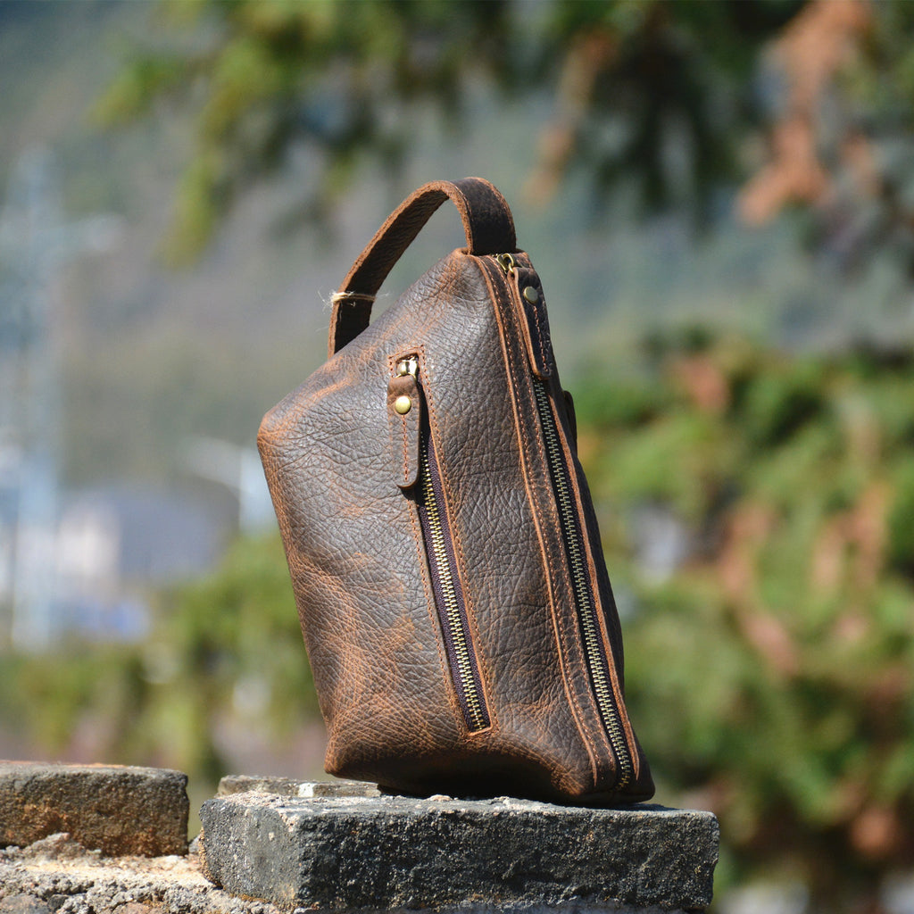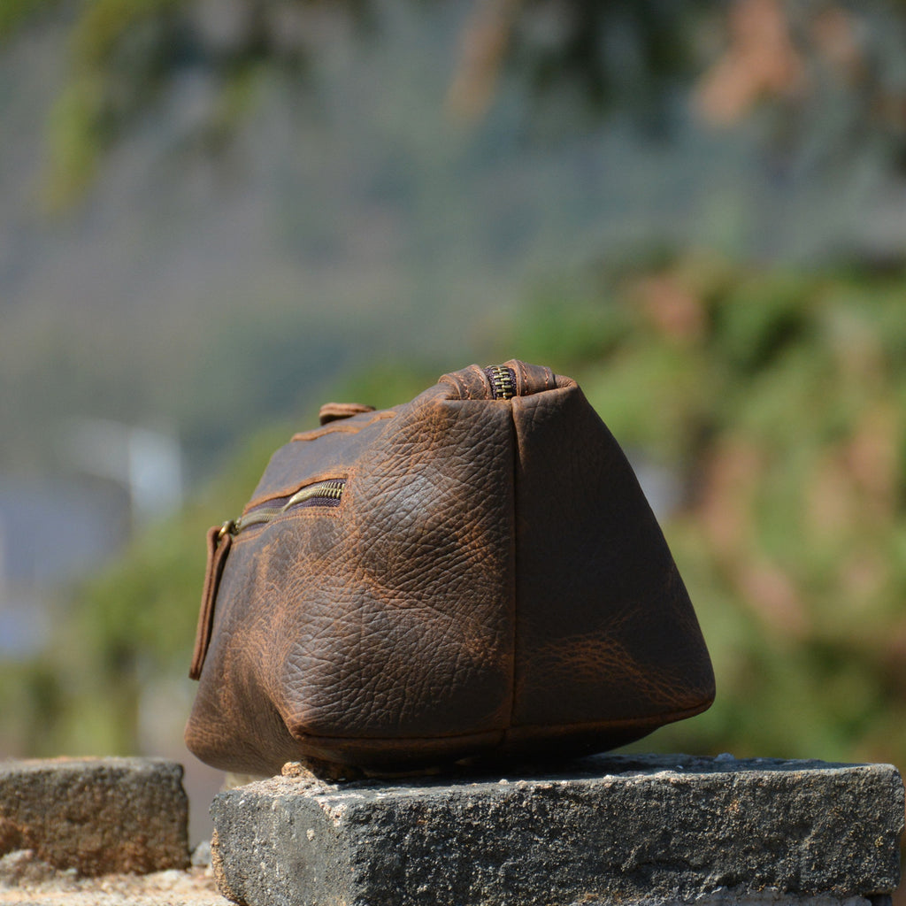 Brown Leather Toiletry Bag - Full Grain Leather Vintage Design
