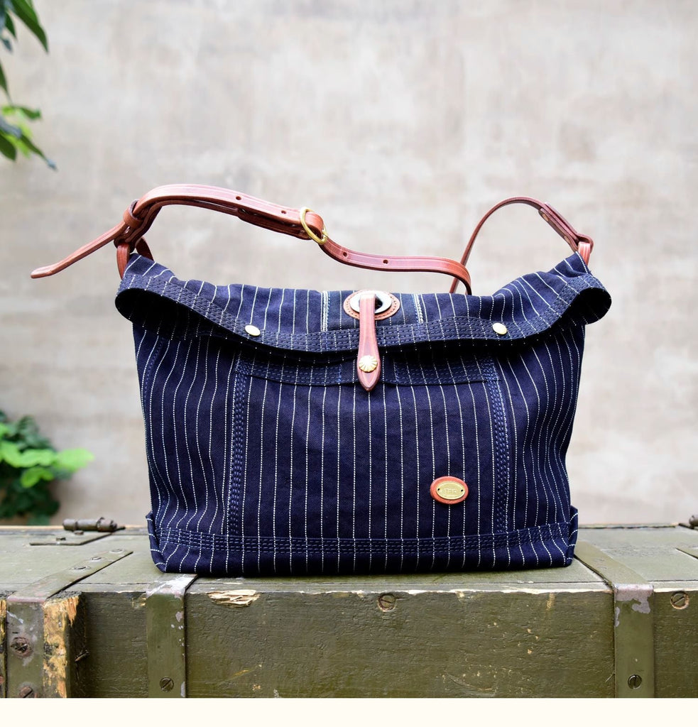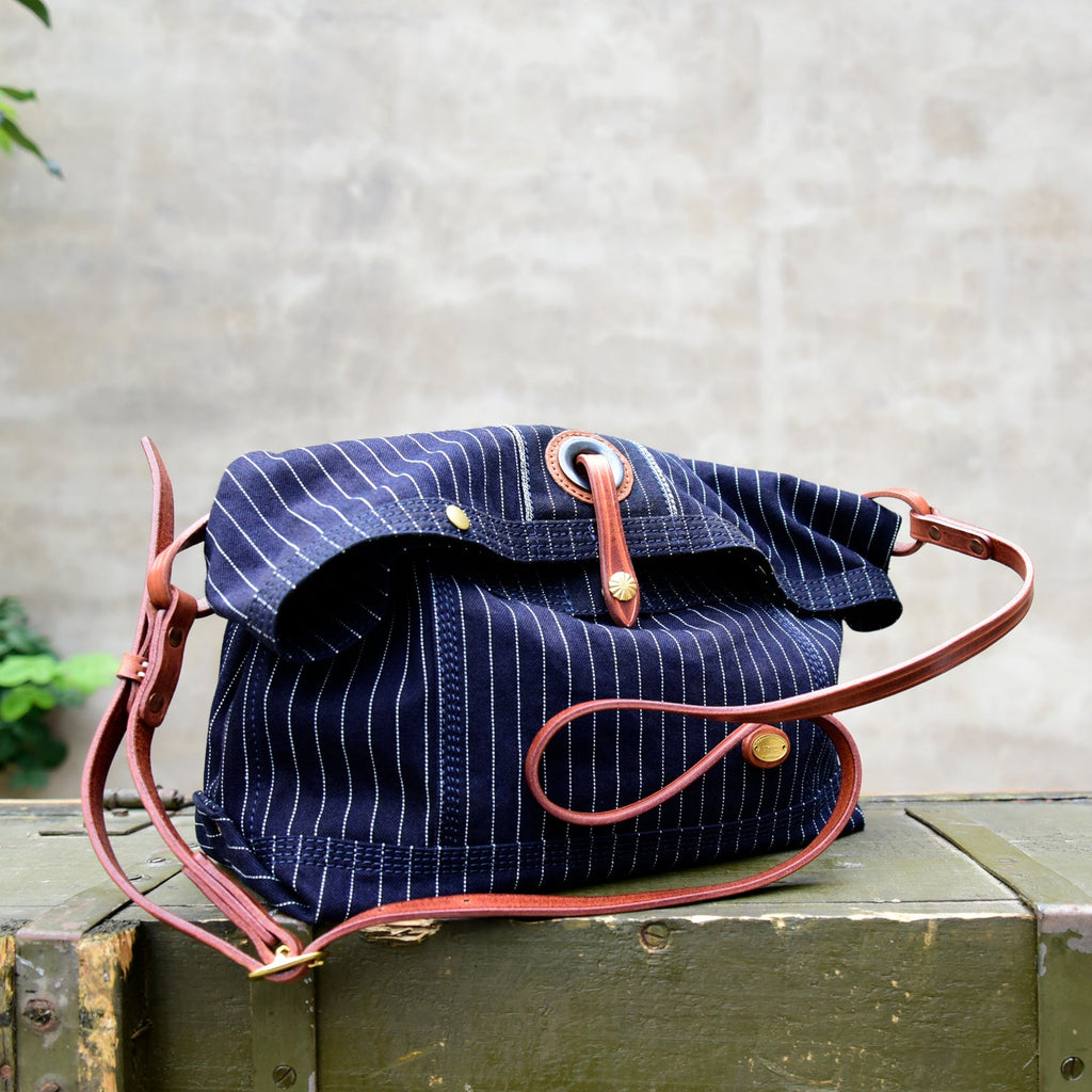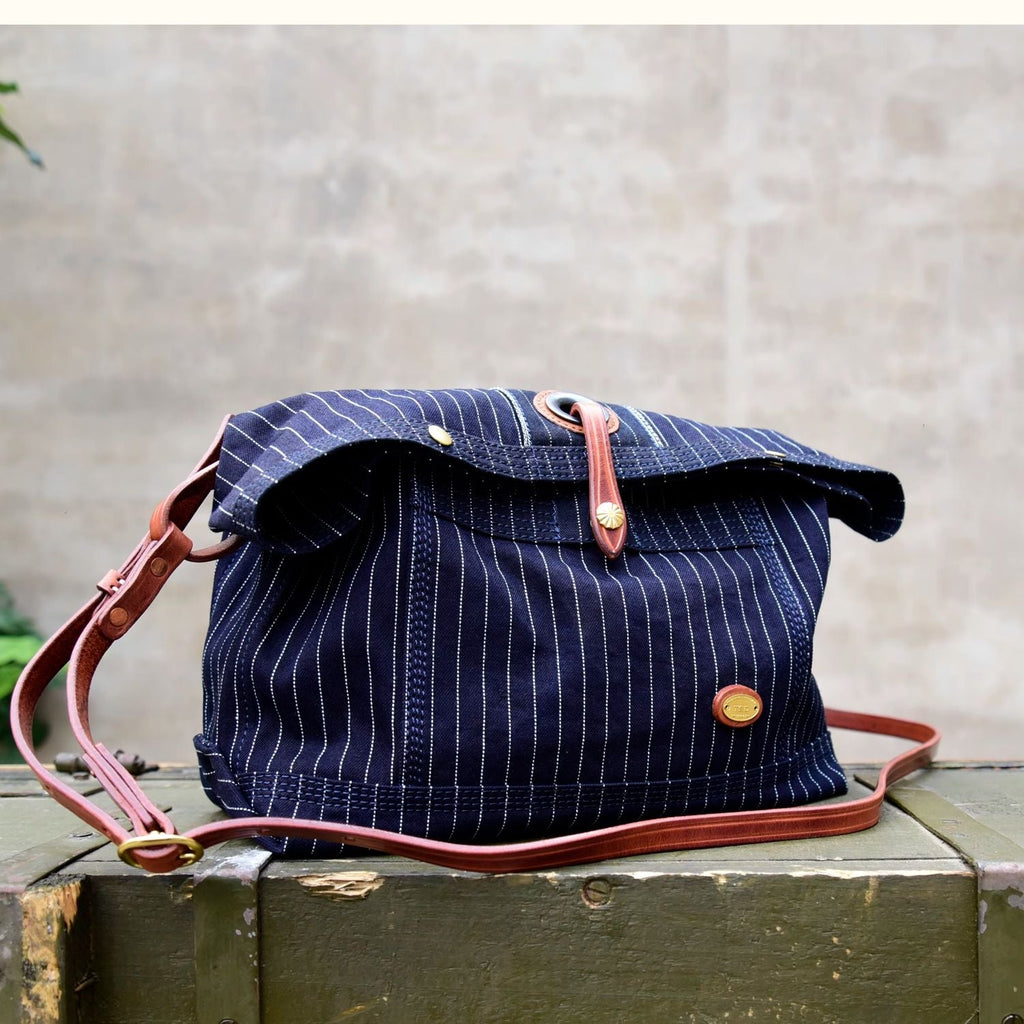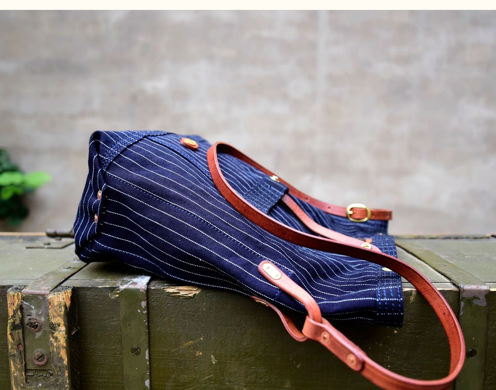 Design: Blue Striped Denim Leather Crossbody Bag for Men Womens Jeans Shoulder Bag Striped Messenger Bag