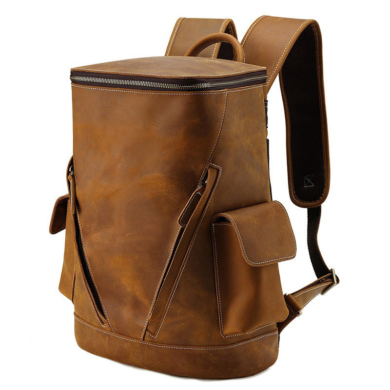 Design: Coffee Bucket Leather College Backpack Men's 14 inches Large Barrel Travel Backpack For Men