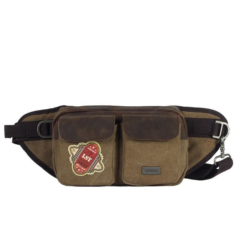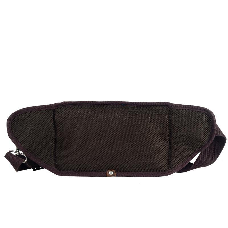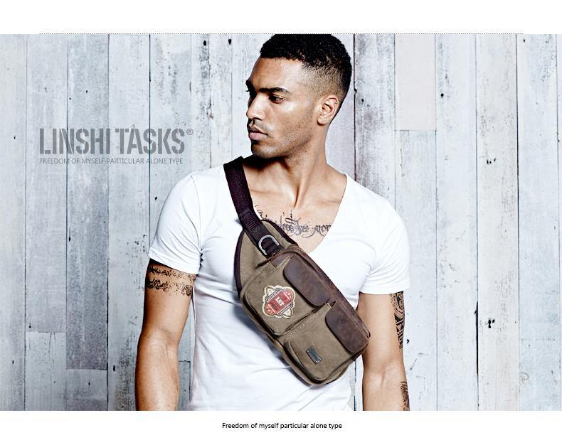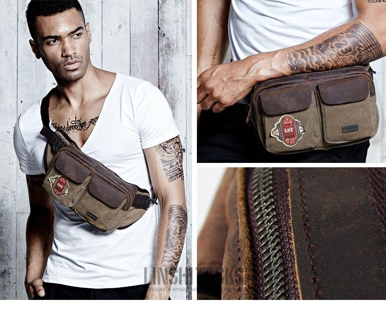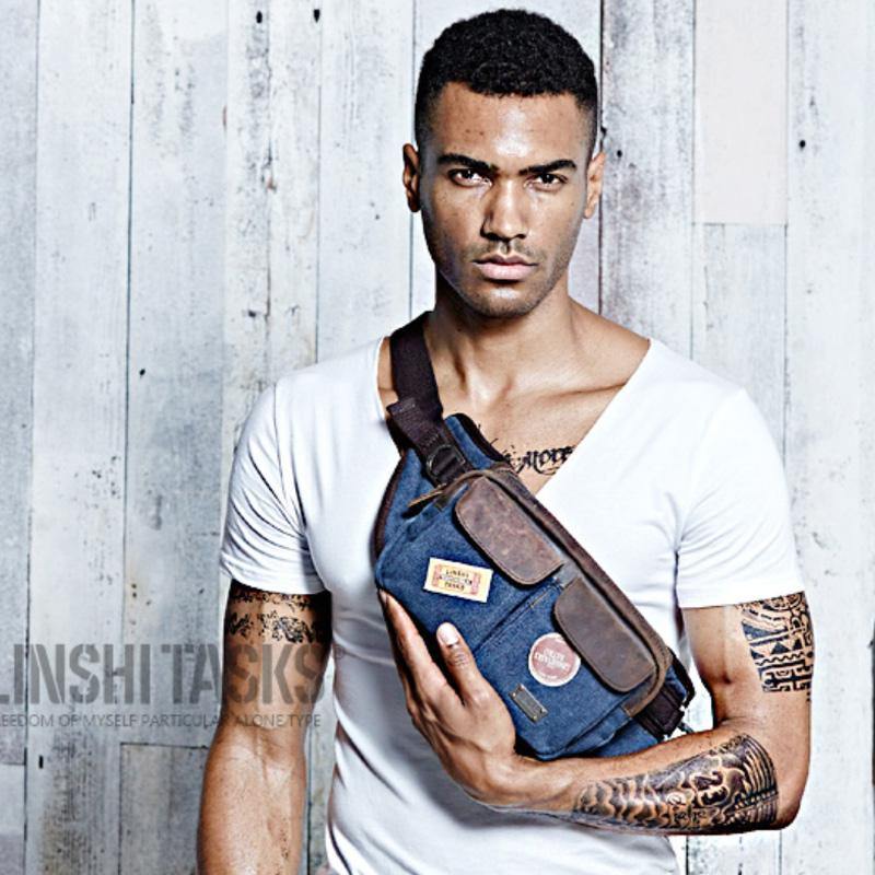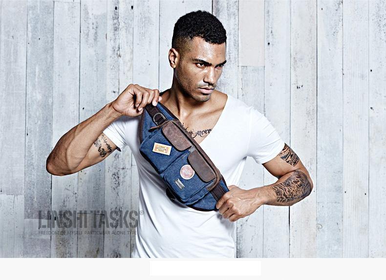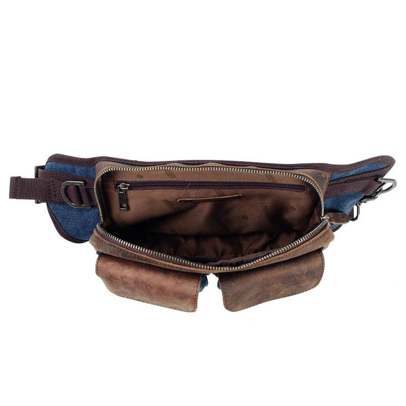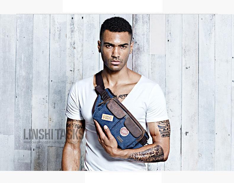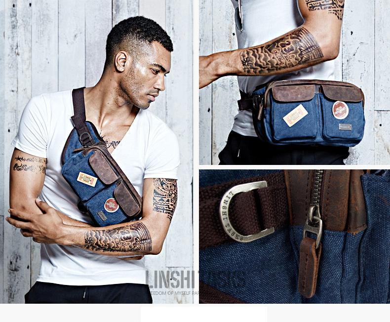 Design: Navy Blue Canvas Leather Fanny Pack Men's Brown Chest Bag Sling Hip Bag Waist Bag For Men