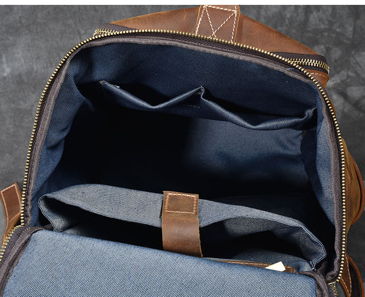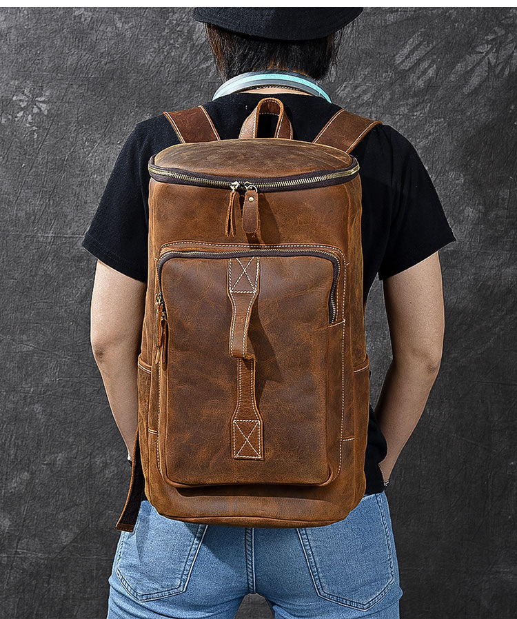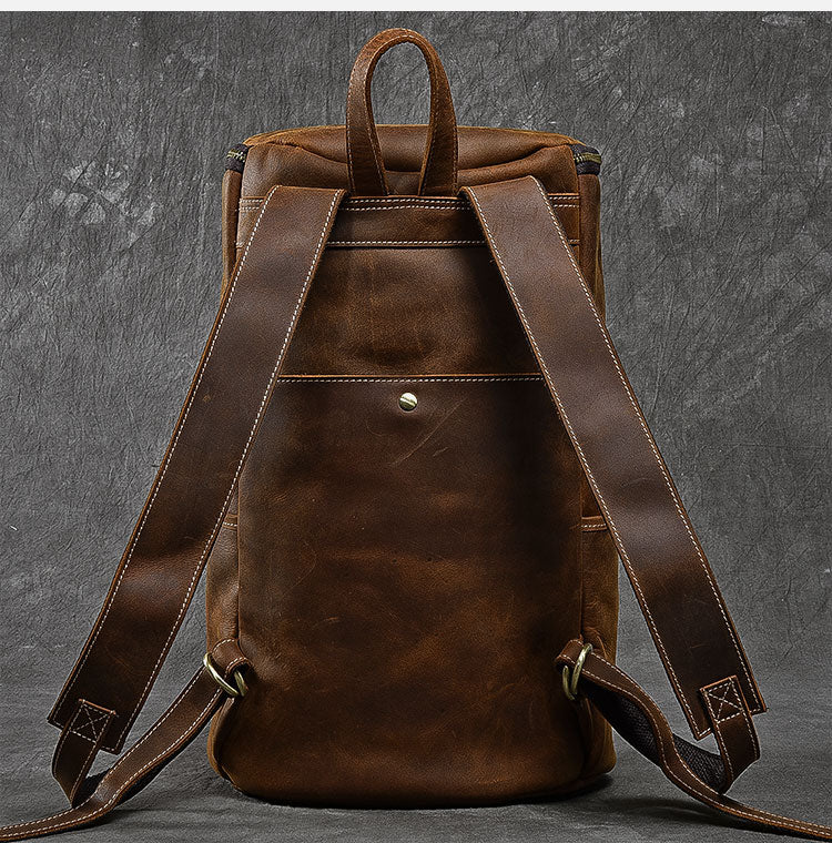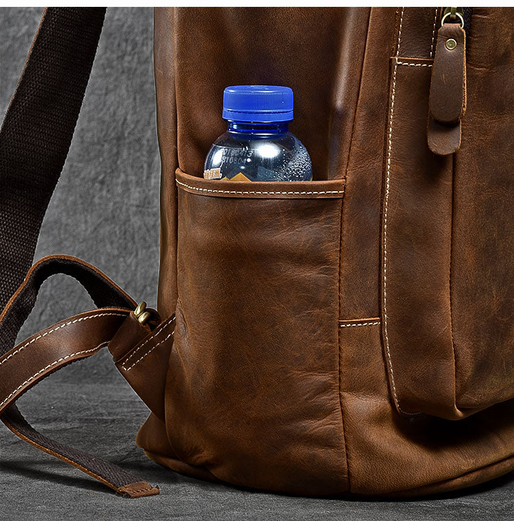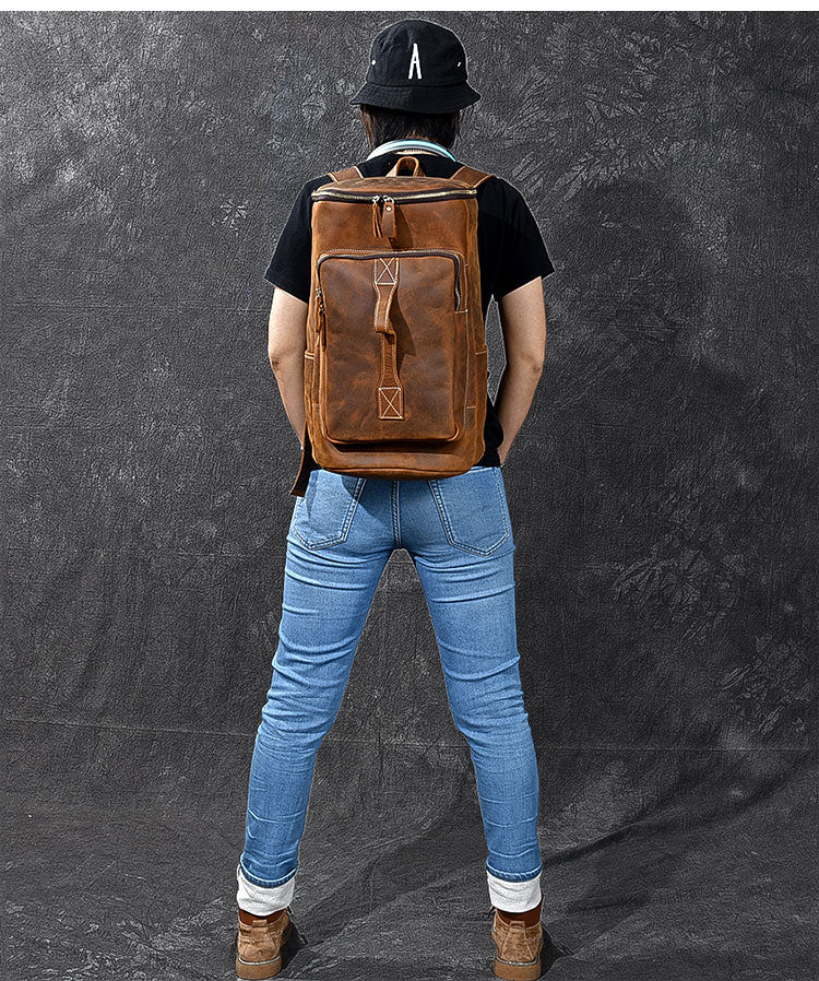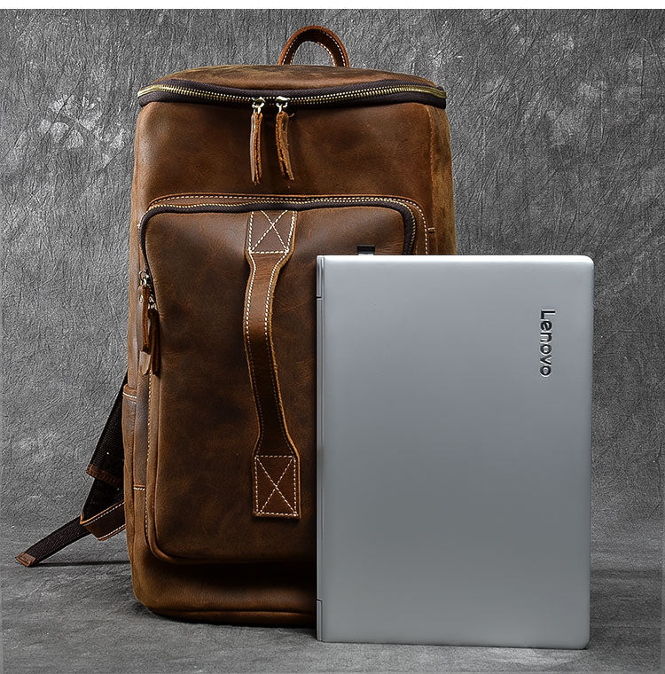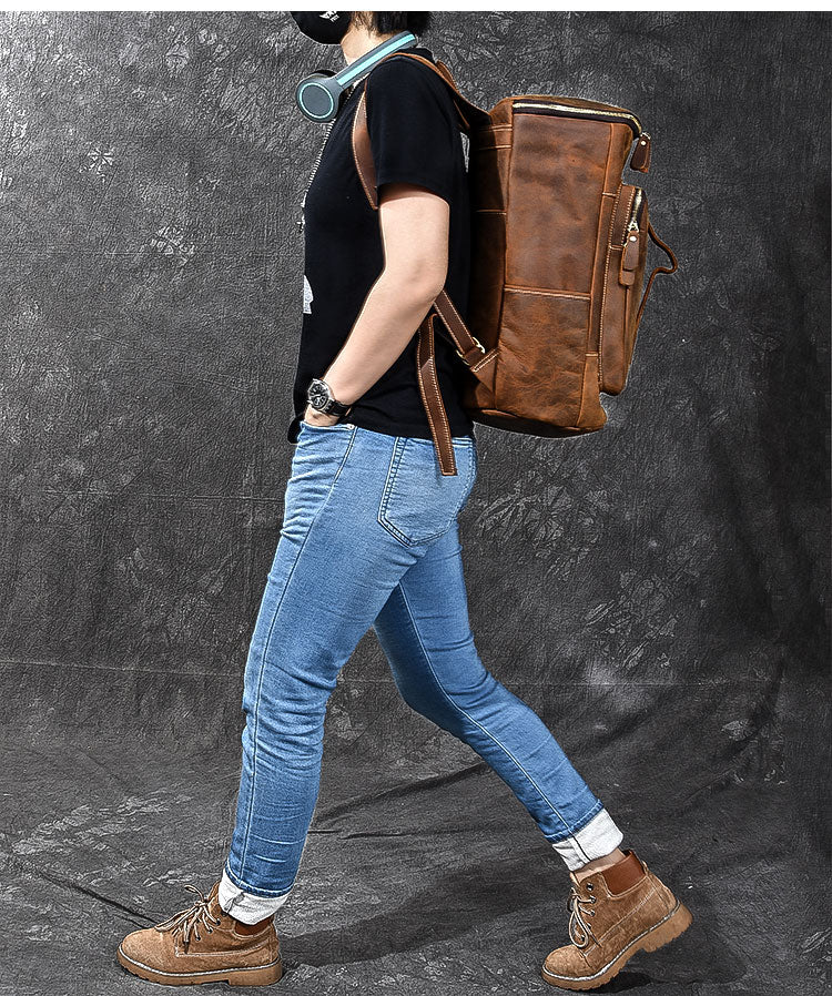 Design: Retro Brown Leather Mens 14" Laptop Backpack Hiking Backpack Travel Backpack Large Backpack for Men