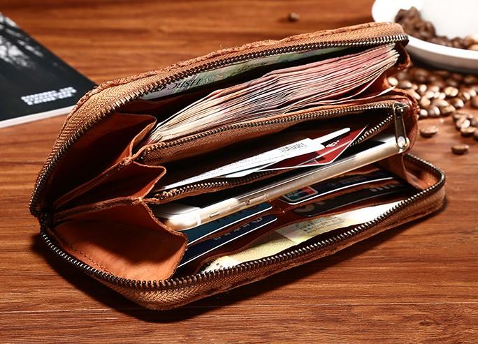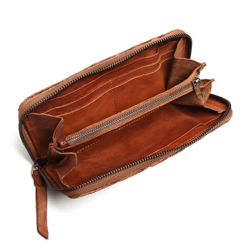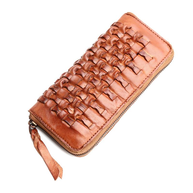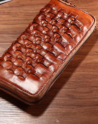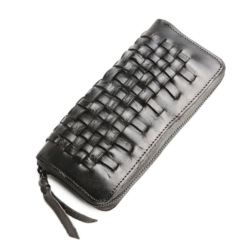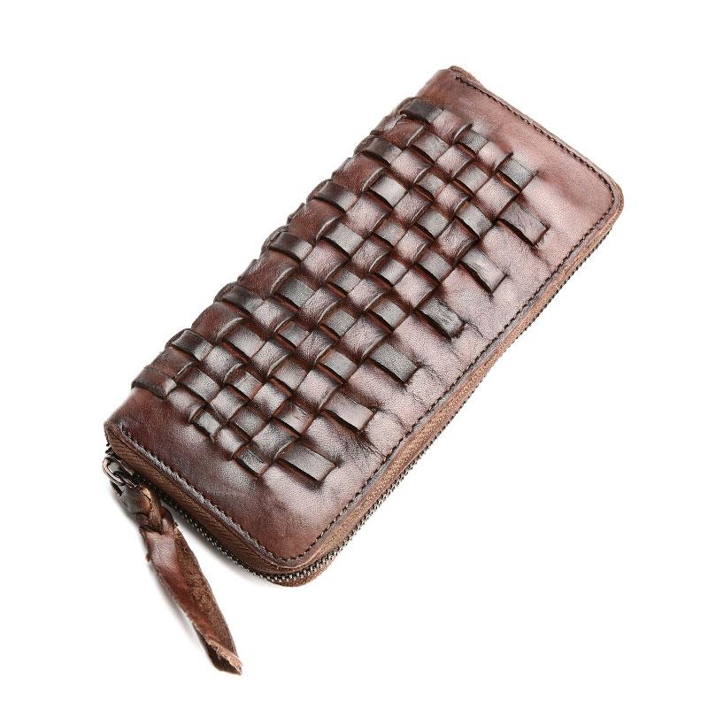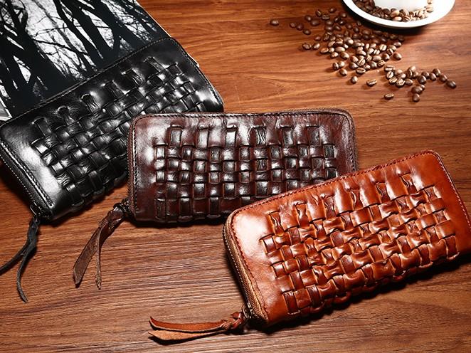 Style: Vintage Braided Leather Mens Long Wallet Zipper Clutch Wallet For Men